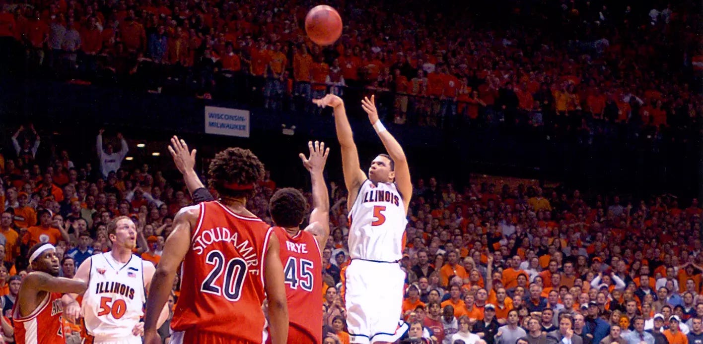 The Deron Williams game-tying three is what most Illinois fans call “The Shot.” Although, to be fair, there are quite a few vying for that moniker, such as Cory Bradford’s shot to beat Indiana as well as Tyler Griffey’s layup to beat Indiana. Illinois likes beating Indiana.